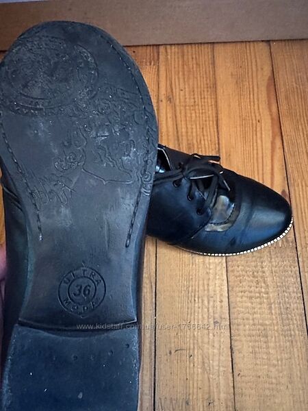 Чорні шкіряні туфлі на шнурівці, з лакованими вставками. В гарному стані.Має маленький каблук в 1 см. Довжина устілки 22.5 см.