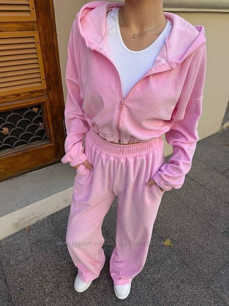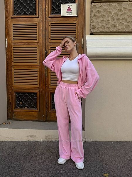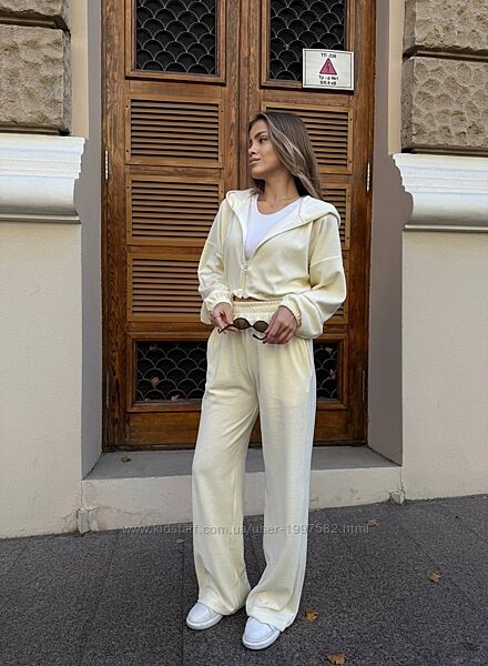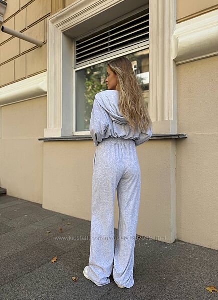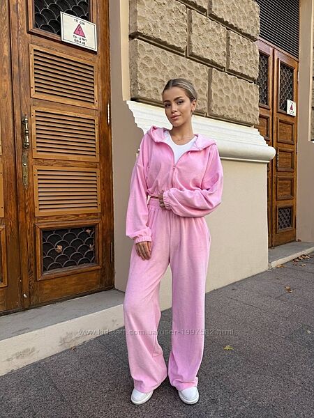 Він складається з вільних штанів широкого крою на гумці та оверсайз худі на блискавці з капюшоном.