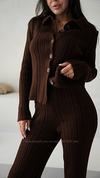 Інші брючні костюми, Ви можете переглянути за посиланням: https://www.kidstaff.com.ua/user-anno-1997582/sect...Елегантний в´язаний костюм Drift у стилі casual chic – поєднання комфорту та сучасного мінімалізму. М´який трикотаж із фактурним рубчиком, приємний до тіла. Кардиган на ґудзиках з коміром-сорочкою, довгий рукав, прямі штани з вільною посадкою, візуально подовжують ноги, контрастні гудзики додають стильний акцент.