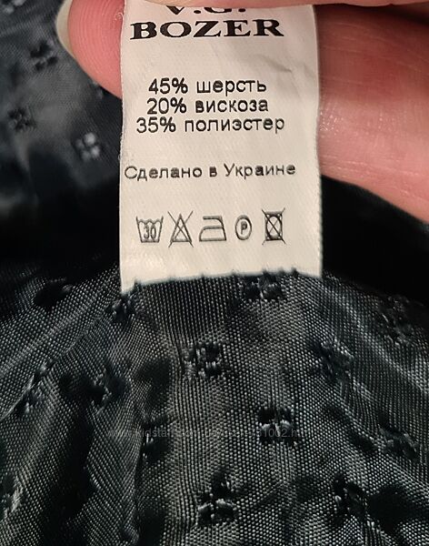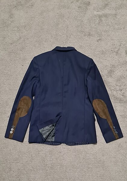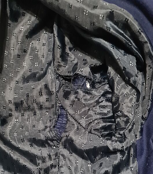Костюм (жакет + брюки) в гарному стані, після однієї дитини. На тканині є малопомітні потертості. З нюансів - пошкоджена підкладка в районі лівої пахви. Колір костюму: темно-синійСклад тканини: 45% вовна, 20% віскоза, 35% поліестер.