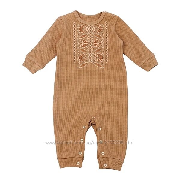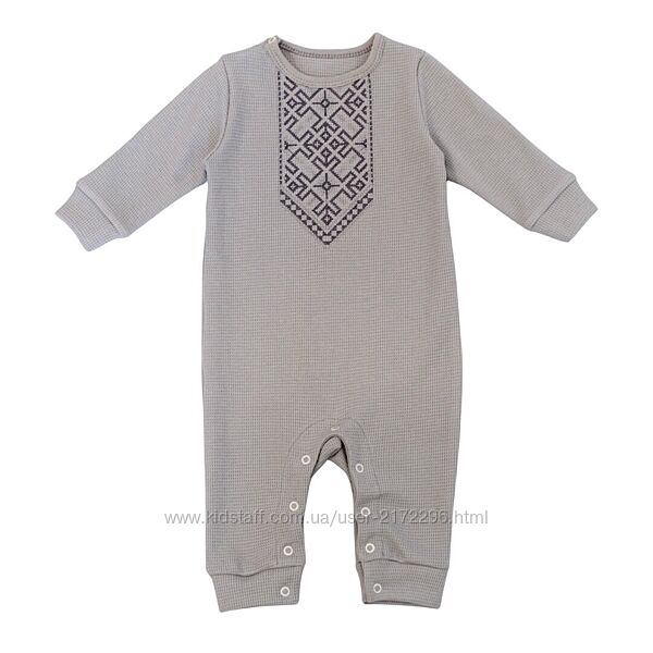 З першого погляду цей дитячий ромпер приваблює своєю продуманою простотою. Виготовлений з м´якого полотна інтерлок вафелька, яке приємне на дотик, добре пропускає повітря та підходить для ніжної дитячої шкіри. Однотонний колір гармонійно доповнений вишивкою орнаменту на грудях, що надає моделі особливий акцент.Полотно: Інтерлок вафелька (100% бавовна)