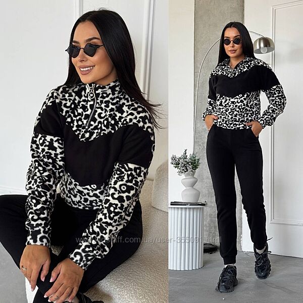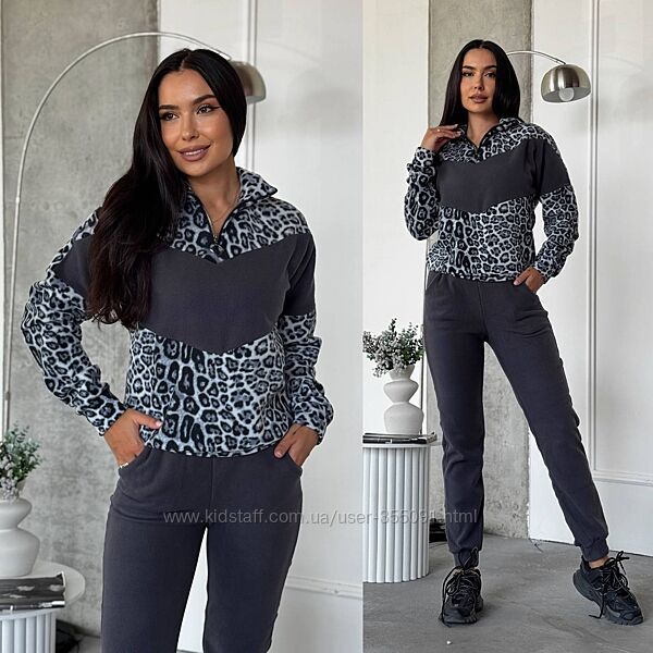 Опис: Стильний спортивний костюм із щільного, м´якого і дуже теплого флісу . Комфортний крій, толстовка на блискавці ,штани на резинці з манжетом.