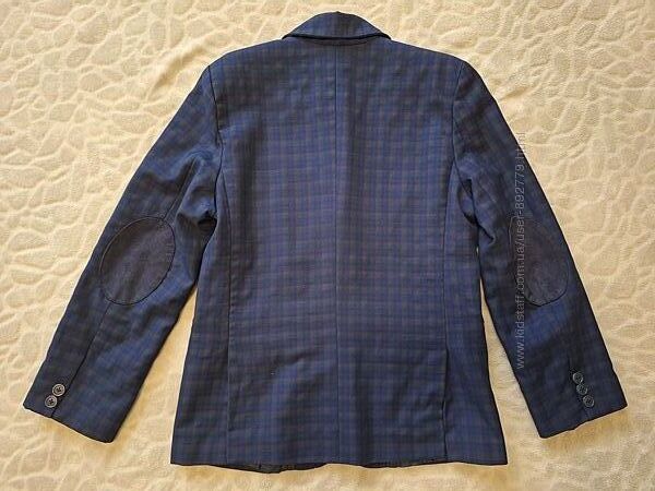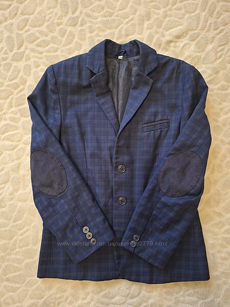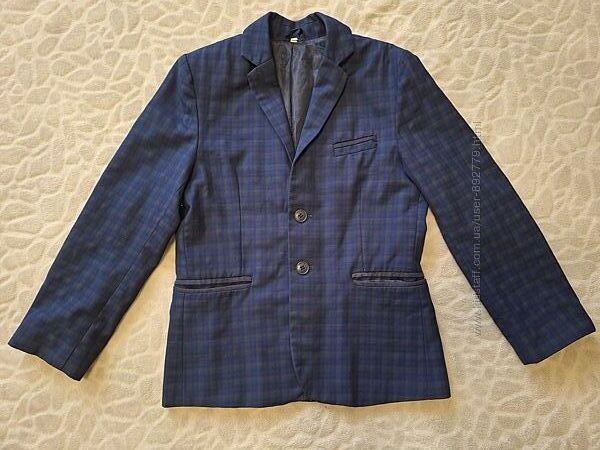 Синій піджак у клітинку. Розмір 140 см. Заміри: плечі 35см, довжина рукава 50 см, ширина під руками 42 см, довжина по спинці 55 см. Ціна