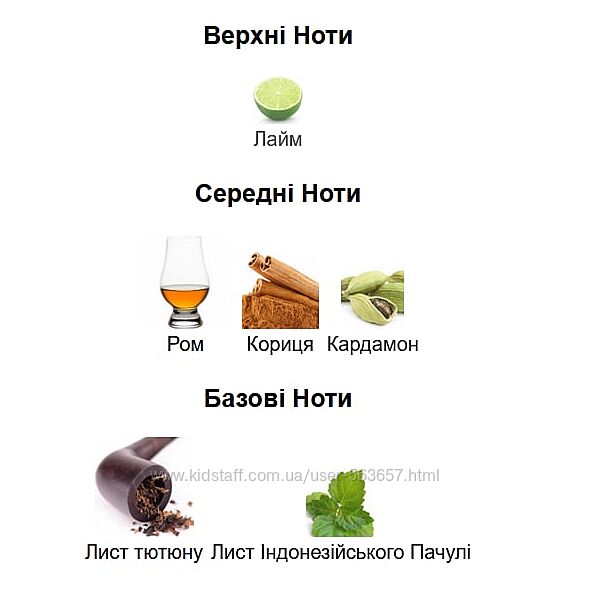 ноти серця: Ром, Кориця і Кардамон; ноти бази: Лист тютюну і Лист Індонезійського Пачулі.