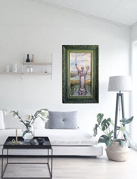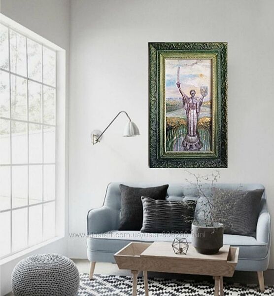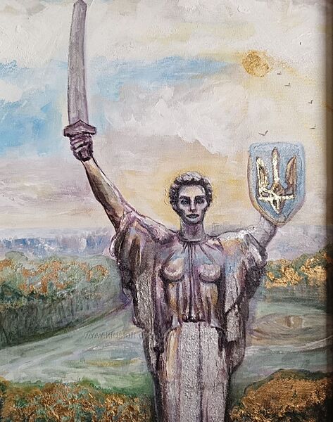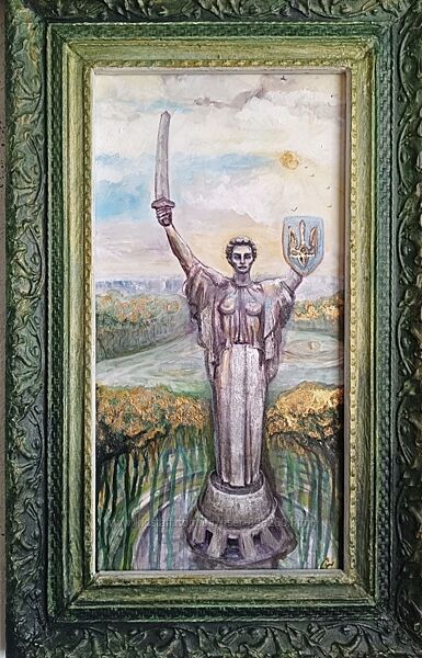 Батьківщина Мати", виконана акриловими фарбами з сусальним золотом і покрита акриловим лаком, рама вінтажна, дерев´яна 10 см шириною і глибиною 3 см. Розмір картини в рамі 49 см /79 см.Езотеричний сенс: