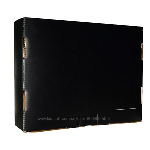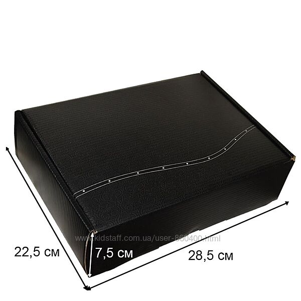 Подарункова самозбірна чорна картонна коробка з відкидною кришкою, зверху ледве помітний сірий орнамент і білий малюнок ремінця на заклепках.Розмір: 28,5 х22, 5х7, 5 см.