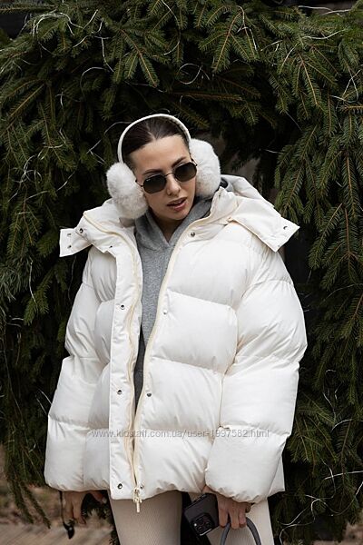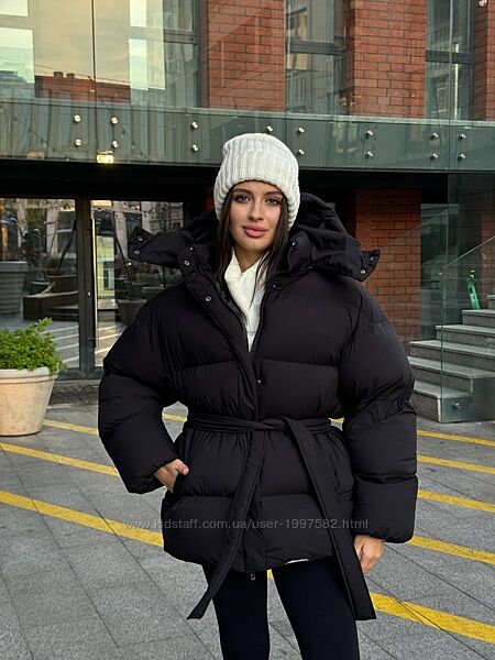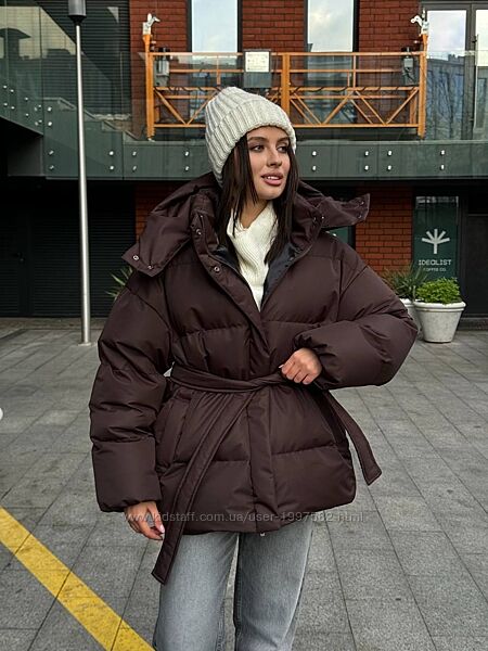 Пуфер "Daria" на застібці і кнопках, знизу регулюється гумкою, є 2 внутрішні кишені, 2 кишені зовні, капюшон знімається на блискавці, рукави знизу на гумці, пасок у комплекті