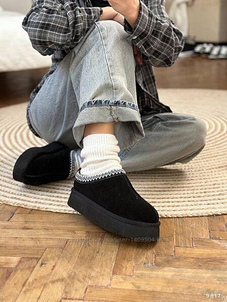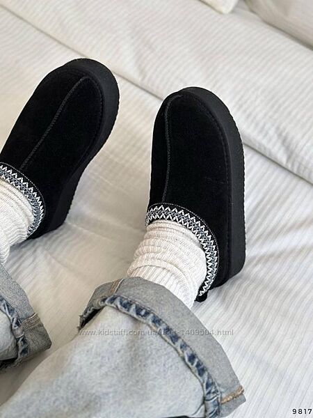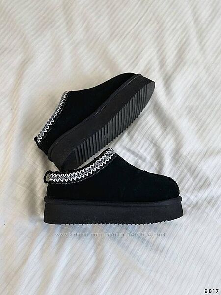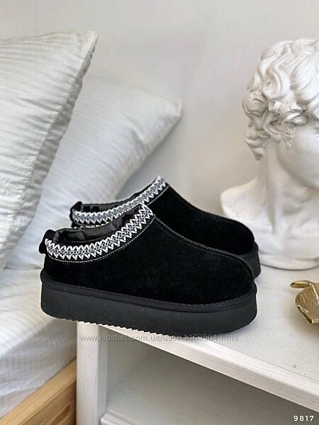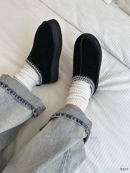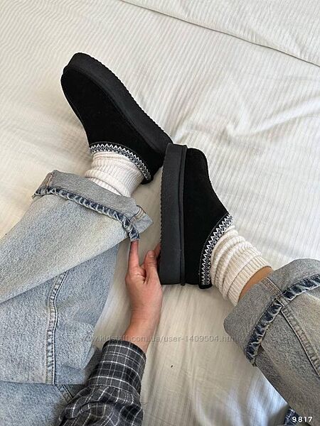 Чорні низькі уггі з натуральної замші. По верху оздоблені вишивкою. Середина та стелька - натуральне хутро. Ззаду є петелька для зручності взування. Легенькі та зручні. Підошва холодостійка. Стильні та сучасні уггі.