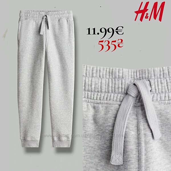 Фото 1-3. Світлосірі. H&M.Наявність. Спортивні штани з м´якої бавовни з м´яким начісованим внутрішнім шаром. Еластичний пояс зі шнурком, бічні кишені та ребристий низ. Злегка звужений крій.Розмір 170 см