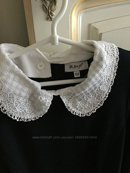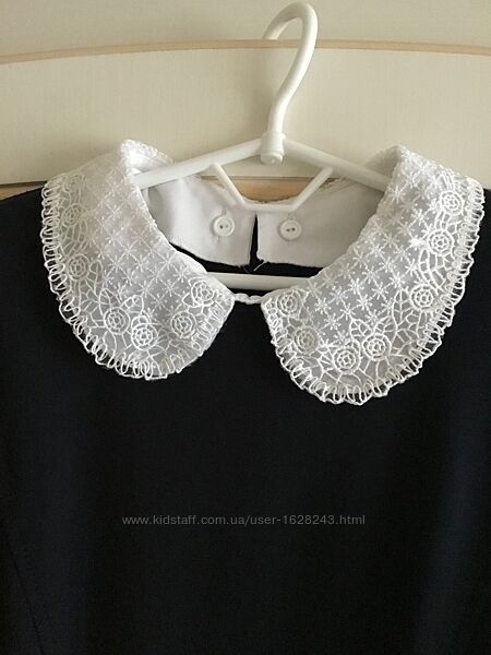Дуже ошатне плаття зі щільного крепового трикотажу, стан нового, без дефектів, склад тканини на фото. Білосніжний комір на ґудзиках. Модель приталена трапеція. Застібуються на спині на блискавку.Заміри дам за запитом.