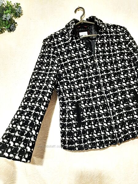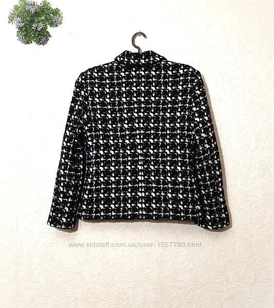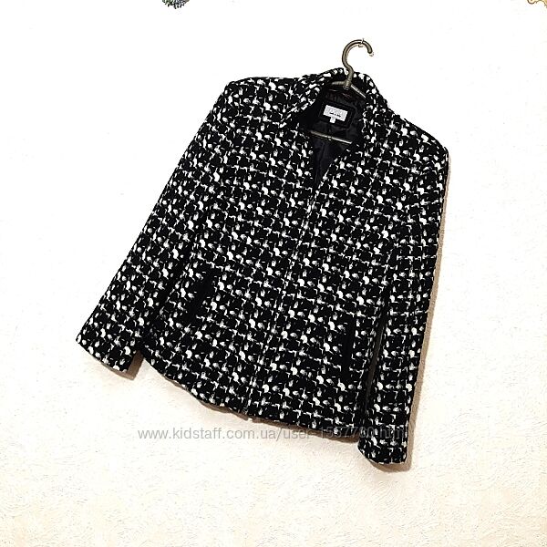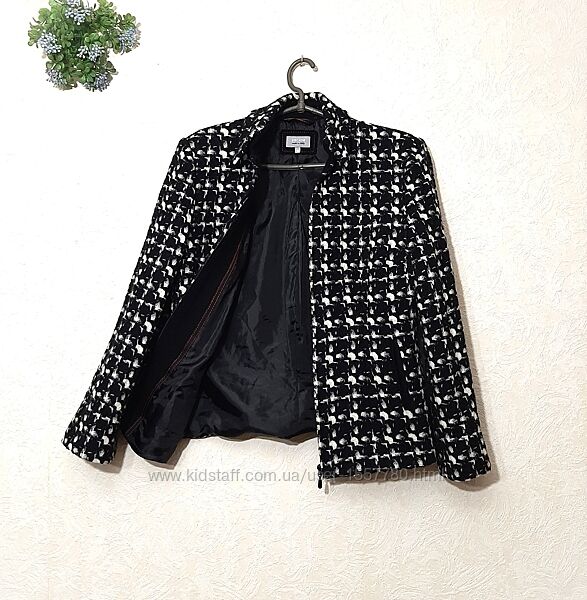Красивий піджак жіночий, чорно-біла клітинка/абстракція, на чорній підкладці, демі/зима.Бренд PER UNA. Маркування розміру 12. Іде на наші розміри 46, 46-48. Порівнюйте по вимірам.