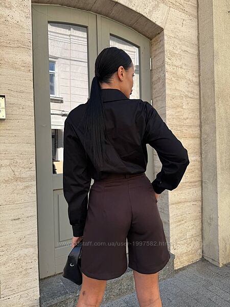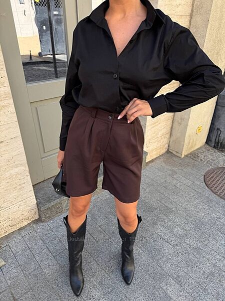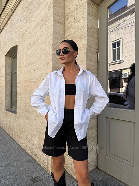 Вільна класична сорочка з довгими рукавами та відкладним коміром, та елегантні бермуди. Образ виглядає сучасно, стримано й дуже вишукано