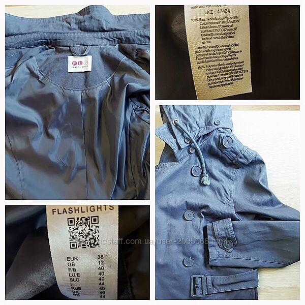 Тренч бренду Flashlights ( Німеччина)в дуже гарному стані.Стильний та практичний,має каптур(капюшон) Двобортний, з погонами і відкладним коміром, манжетами, поясом і розрізом ззаду. Тренч виконаний з бавовняної матерії з водонепроникним просоченням, Знімний капюшон на кулісці із захистом від вітру. Двобортний крій,ригелі на плечах та по краю рукавів. Довжина по спинці- 82 см довжина рукава:-65 см(внутрішній 48 см) Плечі-41 см Ширина (груди)-50 см Європейська: 38 Міжнародна: M(підійде чудово і на S) Українська: 46 Колір: Синій(найкраще переданий на 1-3 фото) Розмір: Regular Fit Довжина: Вище коліна Склад: 100% бавовна Підкладка: 100% поліестер Відправляю Новою поштою чи Укрпоштою при повній оплаті на карту. Відправляю безкоштовно при повній оплаті. Повернення і обміну немає! Купуйте зважено і відповідально.