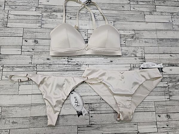 Бюстгальтер оздоблений ґудзиками в атласній обробці та фурнітурою золотого кольору.