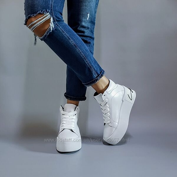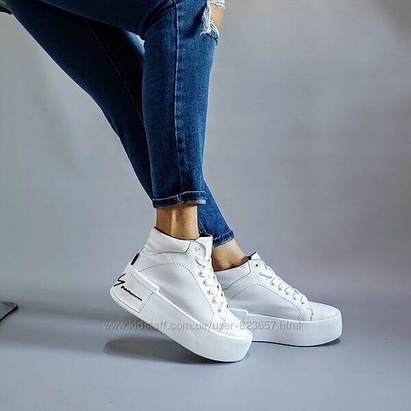 Подробное описание: Білі та чорні шкіряні кеди кросівки на платформі з надписом. Дуже круті.