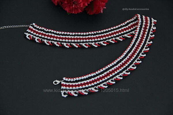 Силянка виготовлена вручну з якісного чеського бісера. Візерунок нагадує традиційні українські орнаменти, а поєднання класичних кольорів робить прикрасу універсальною та дуже виразною водночас. Ідеально пасуватиме до вишиванки або додасть шарму однотонному вбранню.Розмір виробу на фото та матеріали: