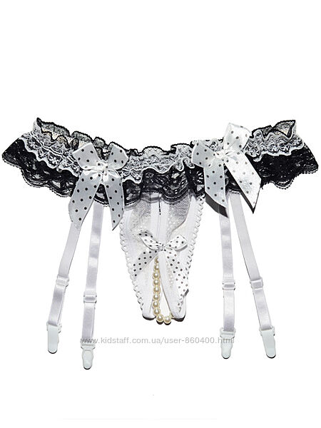 Пояс-труси для панчох (без панчох) з прозорого драпірованого мережива, труси-стрінги з ажурною обробкою по краю, спереду прикрашений двома атласними бантиками, чотири підв´язки, що регулюються.Склад : Поліамід 80% Еластан 20%