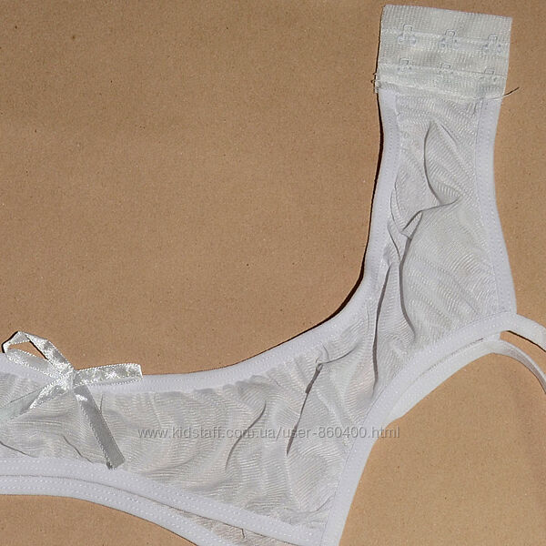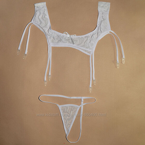 Двошаровий напівпрозорий пояс для панчіх (без панчох), по центру прикрашений маленьким бантиком, застібається ззаду на три гачки (два варіанти), вісім підв´язок.Труси Т-стрінги, спереду трикутник, ззаду утворюють перетин із трьох тонких гумок.