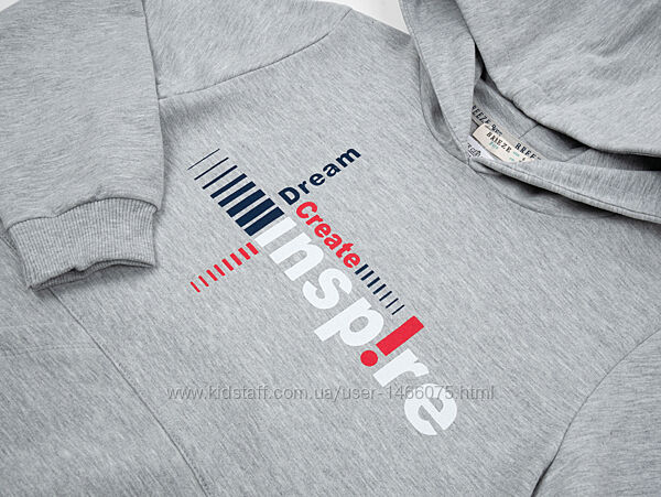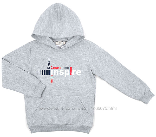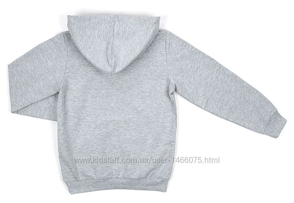 Худі світло-сірого кольору, напіввільного прямого покрою, з довгими вшивними рукавами та каптуром, прикрашений спереду стильними кольоровими принтовими написами. Манжети на рукавах та лінія низу - якісна рібана (подвійна, м´якенька та щільна трикотажна «гумка»). Каптур на трикотажній підкладці.