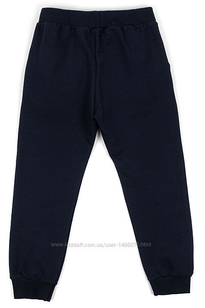 Штани темно-синього кольору, на манжетах, з двома передніми прорізними кишенями, без застібок. Еластичний широкий пояс і манжети - рібана (в подвійну трикотажну «гумку»), забезпечать комфорт і оптимальну посадку по фігурі. Пояс додатково посилений широкою вставленою «гумкою». Штани прикрашені аналогічним кольоровим принтовим малюнком.