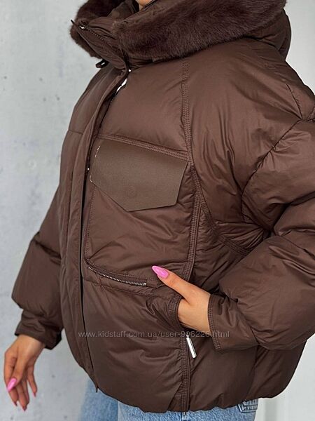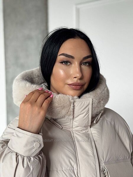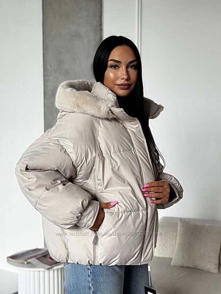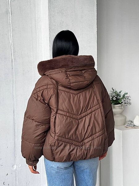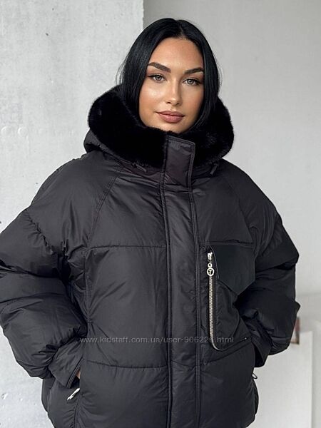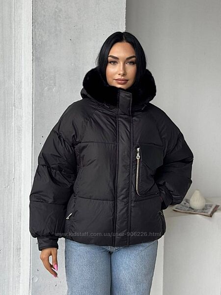 Зимова курточка з капюшоном , з 100% хутром. Присутні кармани з внутрішньої сторони. Кнопки робочі,по низу виробу різинка.Зимова куртка