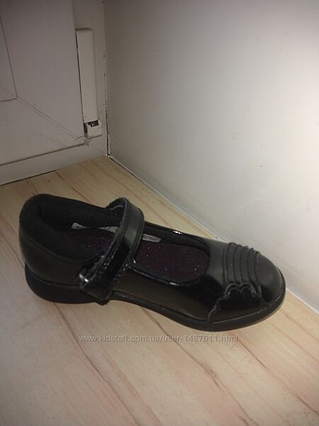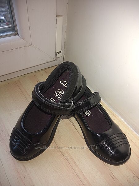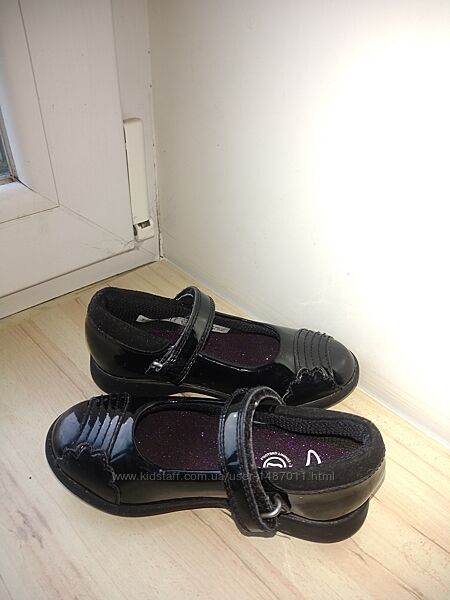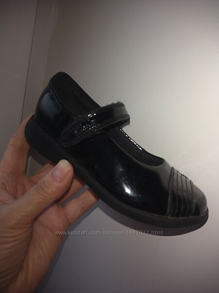 Туфли Clarks чёрные для девочки. Размер 25,5, длина по стельке 15см. Туфли в классическом стиле - "лодочки" с застёжкой ремешок на "липучке". Материал верха - лакированная кожа. На литых, не скользких подошвах.Туфли очень лёгкие, удобные и комфортные.