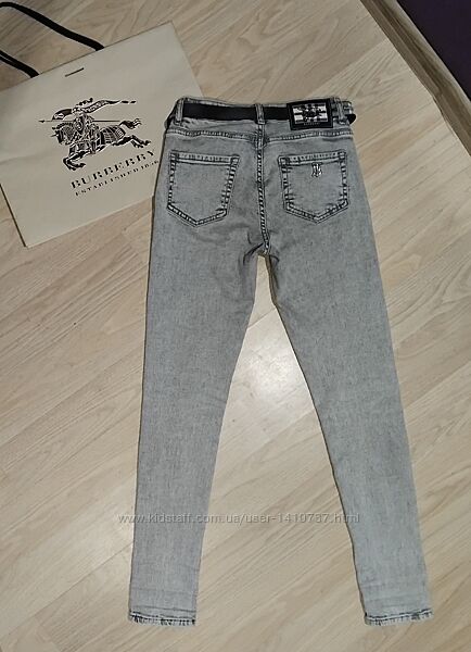 Продам классные серые джинсы в стиле Burberry. Сшиты добротно и качественно. Ткань стрейчивая и немного тянется. Имеют оригинальный дизайн. В комплекте ремень и брелок с логотипами бренда. Отлично садятся по фигуре и стройнят. Покупала в магазине на 3800 грн,одевала 2 раза,состояние идеальное! Как новые. К джинсам идёт брендовый пакет. Размер указан 26,но подходят и на 25 Ширина в талии 32 см и тянутся до 34 см Ширина в бёдрах 43 см и тянутся до 45 см.