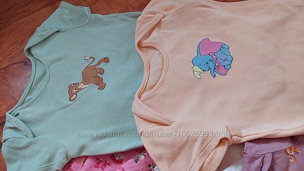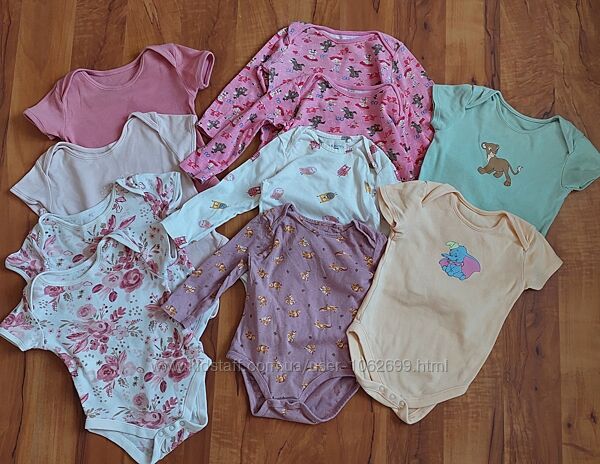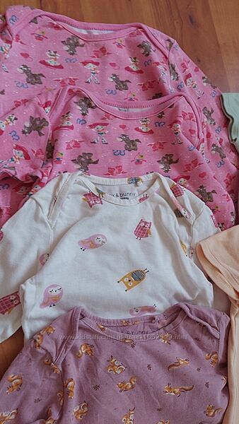 боді: 2 рожевих з довгими рукавами F&F 6-9, з словами і білками sinsay (80 , але буде на 74), 2 боді з короткими рукавами зелений та персикочий george на 9-12міс( є ледь помітні поямки), 2шт рожевих george 6-9міс, 2шт у квіти george 6-9міс(є ледь помітні плямки біля шиї).