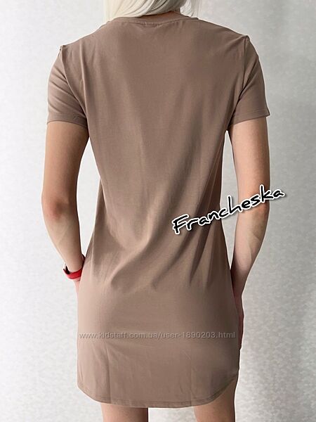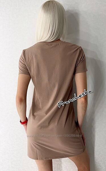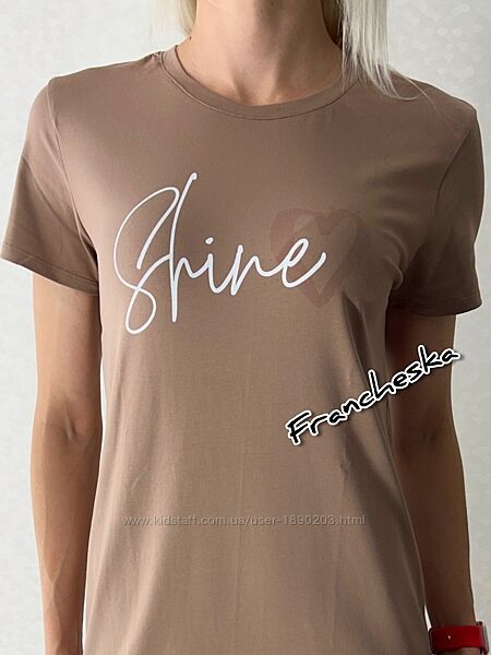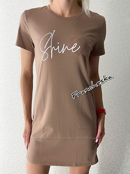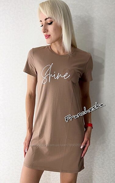 Домашня сукня / нічна сорочка (арт.1761) у кольорі кава з молоком від українського виробника ТМ Roksana - це вдале поєднання ніжності та комфорту. Завдяки універсальному відтінку виріб виглядає стильно та жіночно, підкреслюючи природню красу.Модель виконана у класичному прямому крої з коротким рукавом, що робить її зручною та практичною під час сну чи домашнього відпочинку. Спереду прикрашена сучасним принтом "Shine", який додає особливого шарму.