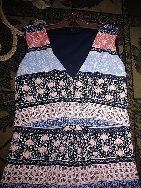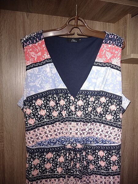 Платье BM Casual женское трикотажное. Размер английский 24 - соответствует нашим 58 - 60 размерам. Пёстрая расцветка в сине - бежевых тонах, с абстрактным принтом. Платье отрезное по линии талии, без рукавов, У - образный вырез горловины. Материал - тонкий трикотаж, хлопок с добавлением эластана. В области груди - усилено двойным трикотажем.Длина 130см, окружность груди 135см, окружность талии 110см, окружность бёдер 145см.