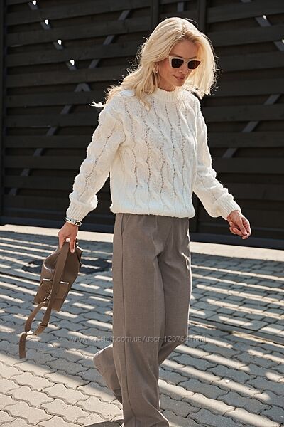 Теплий об´ємний светр із класичним візерунком "косами".Виготовлений напівпрозорим плетінням із ніжної, м´якої пряжі з додаванням шерсті мериноса та кідмохеру.