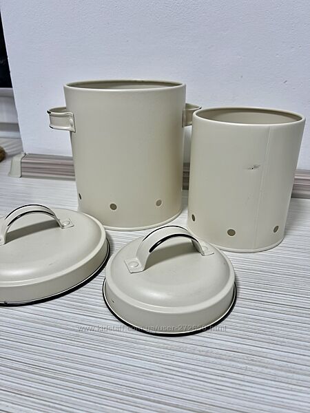 часнику, цибулі та картоплі. Банки мають зручні ручки та кришки, що допомагають зберігати свіжість продуктів. Стильний світлий колір та вінтажний дизайн прикрасять будь-яку кухню. Ідеальний набір для організації простору на кухні.