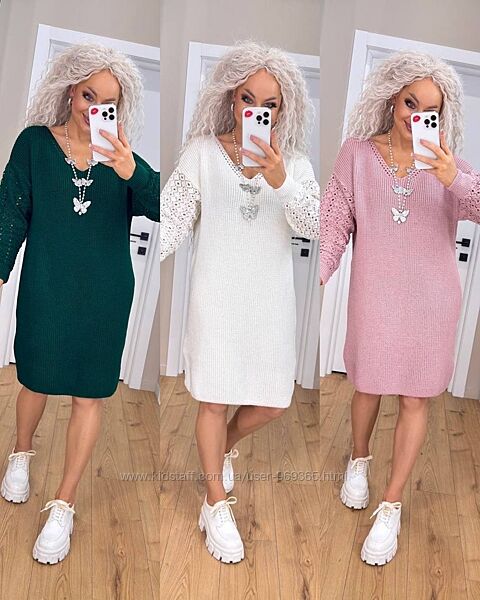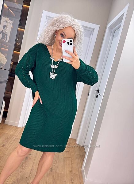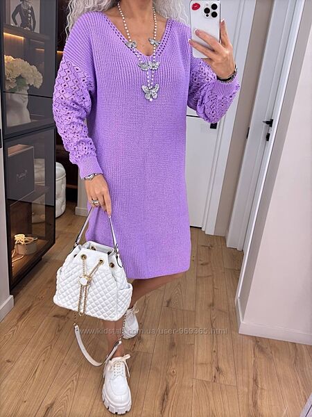 В’язана сукня комфортного вільного крою з акцентними ажурними рукавами. Стильний V-подібний виріз додає жіночності, а універсальна довжина робить річ практичною як для повсякденного образу, так і для святкових виходів.