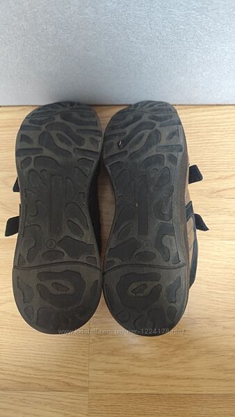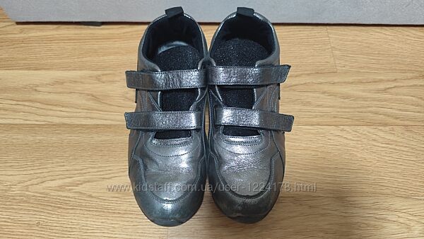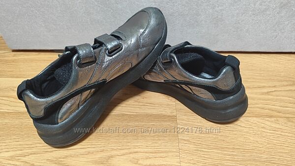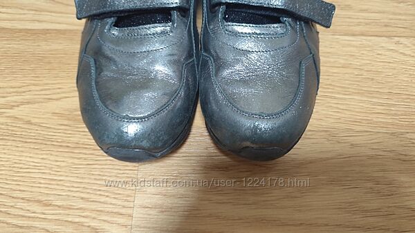 Підліткові кросівки з натуральної шкіри, всередині чистенькі, устілка з натуральної шкіри з супінатором. Стан добрий, липучки тримають відмінно, підошва не стерта, із нюансів - трохи зчесані носочки (дивіться останнє фото), але в силу блискучості кросівок - в носці в очі не кидаються. Розмір 39, устілка 26 см.