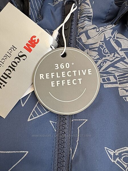 Має водовідштовхувальні властивості, захистить від невеликого дощу. Екологічне та безпечне водовідштовхувальне просочення. 360° Reflective Effect (3M Scotchlite): Світловідбиваючі елементи по всій поверхні куртки забезпечують видимість дитини з усіх боків у темряві.