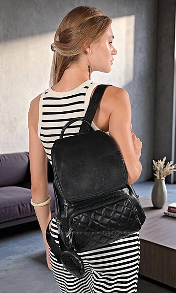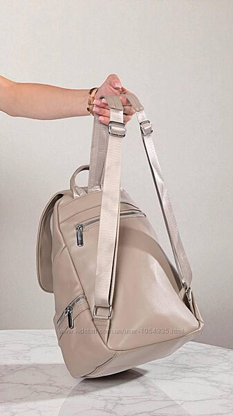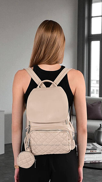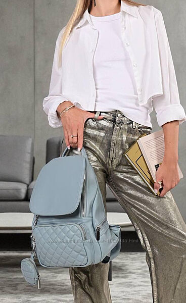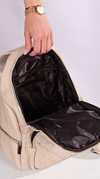 Рюкзак виготовлений зі штучної шкіри, застібається на блискавку та кнопку Усередині один відділ, 2 кишені, одна з яких на блискавці На фасаді та ззаду рюкзака кишеня на блискавці та 2 бічні кишені. В комплекті ключниця розміром 9*9 см Розмір 28*35*12 см Колір: чорний, блакитний, беж, темний беж