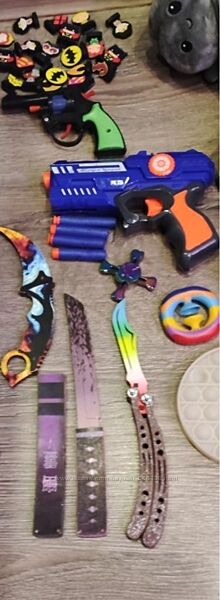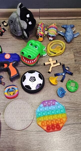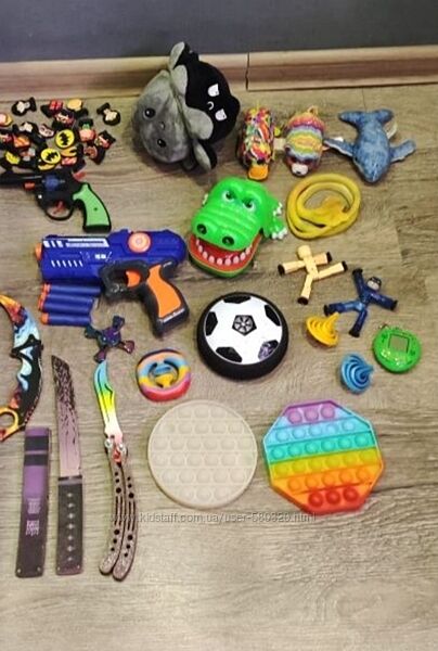 Ножи складываются,попит 10 см, юла, мягкие игрушки,пистолеты оба рабочие,крокодил( от нажатия на определенный зуб, закрывается рот), спинер, фигурки. Цена за все что на фото, набором