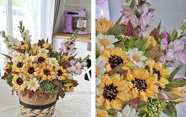 Букет с зефирными цветами: подсолнухами, гортензией, ромашками и гладиолусами - осенний, яркий и праздничный!