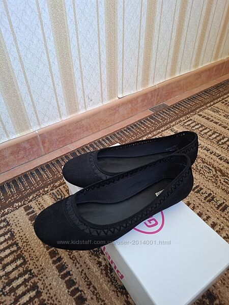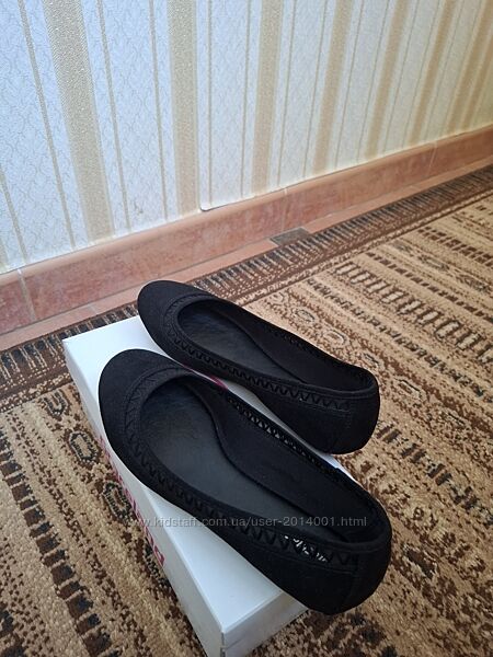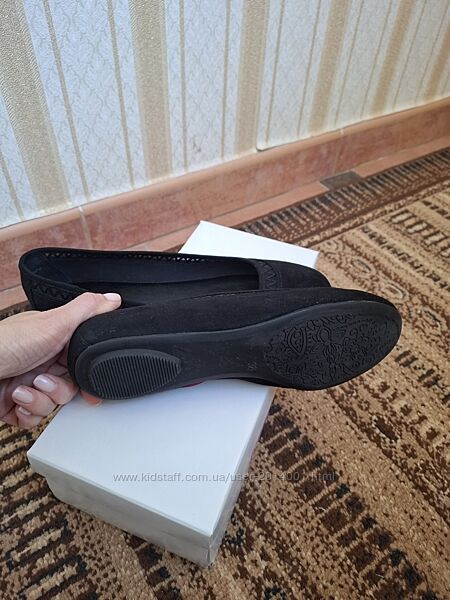Брендові човники, стильні балетки Graceland.Колір чорний, з ажурною окантовкою. Розмір 38 (маломірять). По устілці 23,5 см, по підошві 25 см. Замшеві, легенькі, якісні та дуже красиві.