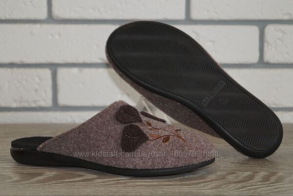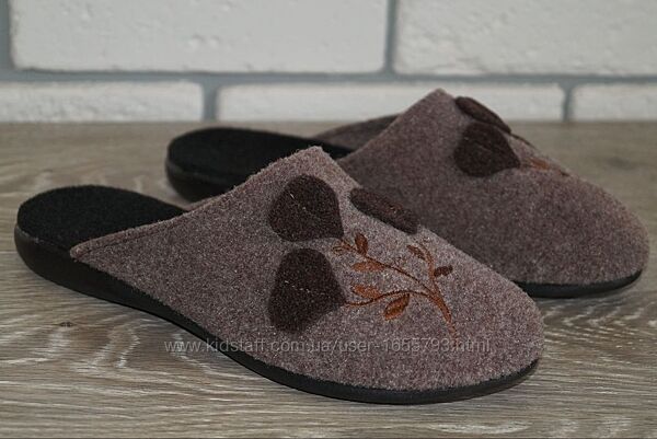 Стильні жіночі кімнатні / домашні тапочки коричневого кольору. Мають якісне пошиття та комфортну колодку.Верх пошитий з мякого приємного на дотик текстилю (фетр). Всередині текстильна (фетрова) підкладка та устілка. Ідеально сидять на ніжці, не спадають під час руху, стійкі до зношування. Підошва максимально легка та гнучка.