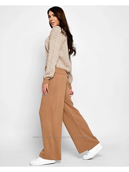 Витончений костюм для сучасного гардероба. Пуловер з м´якої тканини має V-подібний виріз, спущену лінію плеча та оригінальний малюнок у ромби, що додає стилю. Широкі штани палаццо зручно сідають на талії завдяки еластичній резинці, забезпечуючи комфорт на кожному кроці. Ідеально носиться як у комплекті, так і окремо, легко поєднуючися з іншими речами для створення численних look-ів.Сезон- Демісезон Стиль- Повсякденний