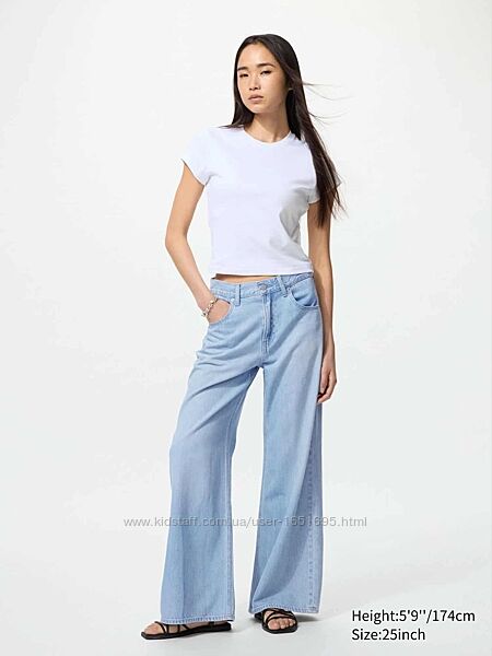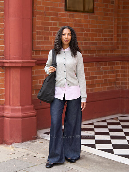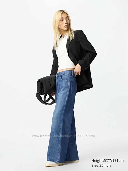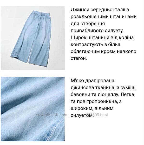 - Широкі штанини від коліна контрастують з більш облягаючим кроєм навколо стегон.