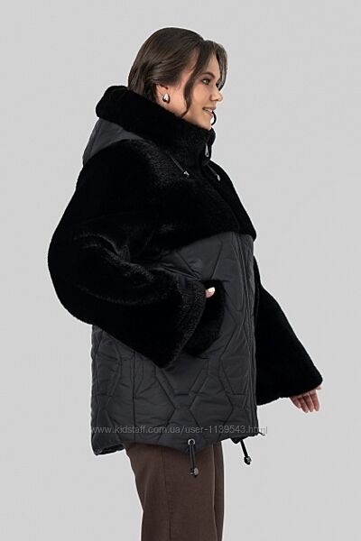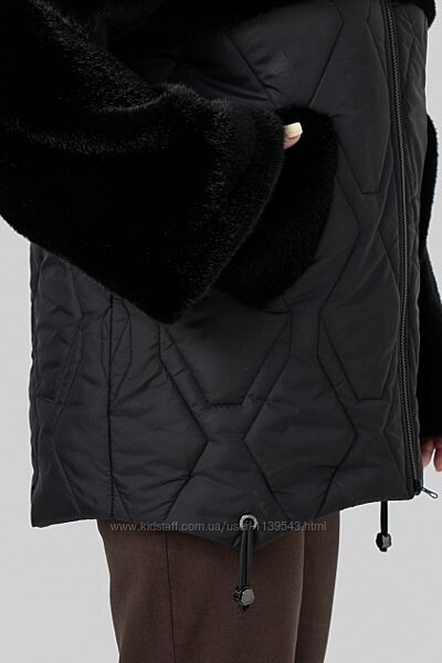 Шуба прямого силуету виконана в комбінації штучного хутра та стьобаної тканини. Спинка та поличка додатково утеплені тинсулейтом 150 г/м². Рукав втачний, одношовний, без додаткового утеплювача, ширина знизу регулюється за допомогою шнура з фіксаторами. Кишеня – фігурна листочка з втачними краями. Капюшон втачний, висота регулюється за допомогою шнура з фіксаторами. Застібка на блискавку. Фігурний низ полиці декорований шнуром із фіксатором. Підкладка: нейлон. Температурний режим: до -5 °C.