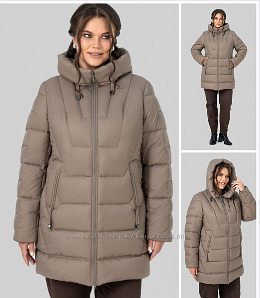 Куртка - пуховик прямого силуэта, выполнена из плащевой ткани. Наполнитель: биопух 200 (г/м²). Рукав втачной, двухшовный, внутри трикотажные манжеты. Карман с листочкой, декорирован шнуром с фиксатором. Капюшон втачной, высота регулируется при помощи шнура с фиксаторами. Застёжка на молнию.Температурный режим: до -15 °C.
