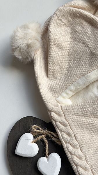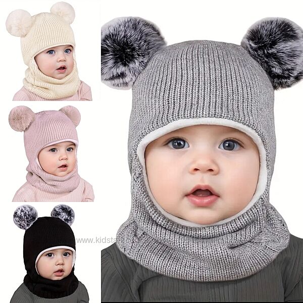 В"язані шапки -шоломи з м"якої суміши на підкладці з плюша с декоративними штучними помпонами зверху. Шоломна конструкція повністю закриває голову, шию, вуха та частково обличчя, забезпечуючи максимальний захист від вітру та холоду. Утеплені флісомКОЛІР-чорний , сірий , рожевий і бежевий