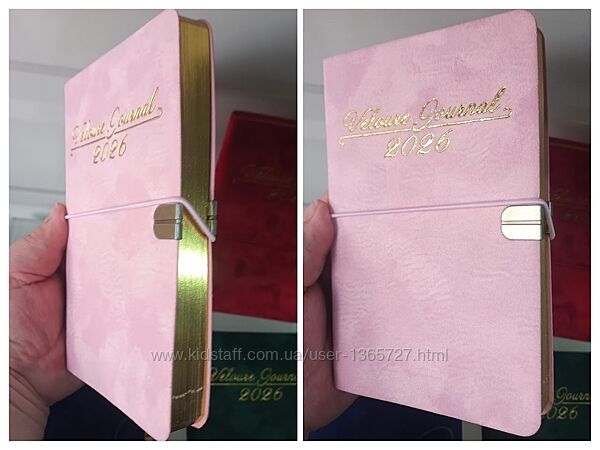 Гнучка обкладинка щоденника VELOUR виконана з штучної шкіри з виразним оксамитовим покриттям. Дві функціональні шильди на лицьовій та зворотній стороні обкладинки з поглибленнями для поперечної гумки забезпечують зручну та надійну фіксацію щоденника в закритому стані. Дизайн гармонійно доповнює та збагачує тонований золотим кольором зріз внутрішнього блоку та тиснення золотою фольгою року і напису на лицьовій стороні обкладинки.