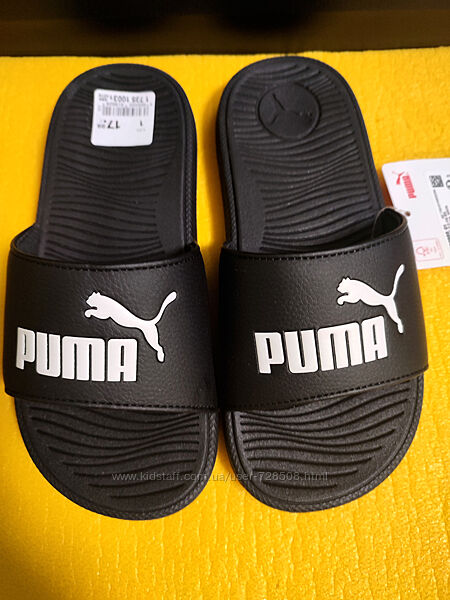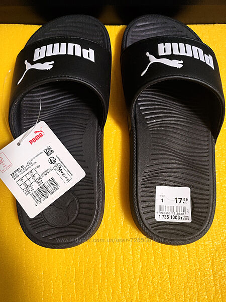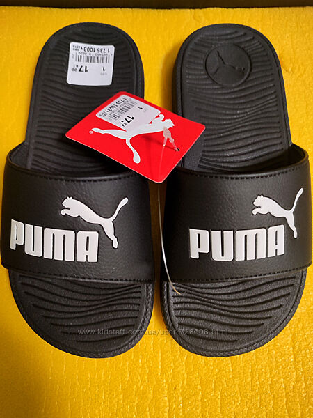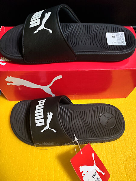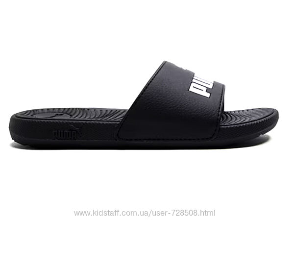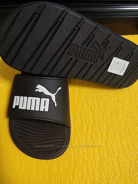 - логотип бренда Puma, расположенный на верхней части шлепанцев и на боковых панелях подошвы, придает обуви стильность;
