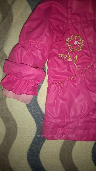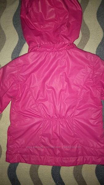 цвет яркий розовый. Верхний слой ткани -мягенькая плащевка со специальной водоотталкивающей пропиткой. Капюшон удобный хорошо держится на голове. Капюшон съемный на кнопках. Внутри курточки х/б подкладка Утеплитель тонкий полиэстер. Низ рукавов на манжете. Внутри по низу кулиски, можно регулировать ширину.
