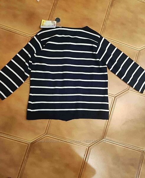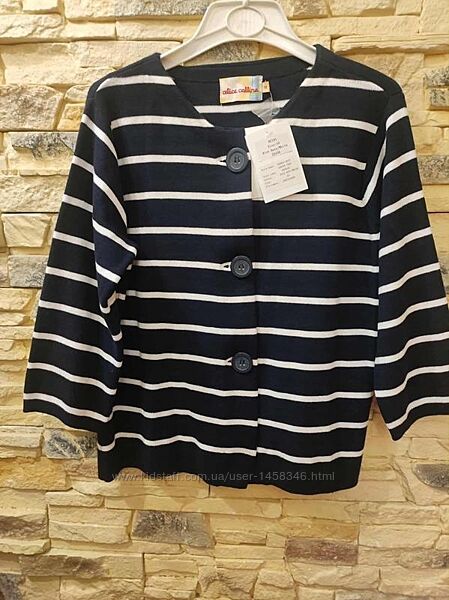 Гарний ,жакет /кардиган Alice Collins , в стилі шанель ,темно-синій і білу смужку, відмінна якість-100% бавовна,розмір 48-50,новий ,без дефектів,,в оригіналі виглядає краще,як на фото,заміри: довжина по спинці 55 см,довжина рукава 3/4 -42см,плечі 39 см,ПОГ 50см.