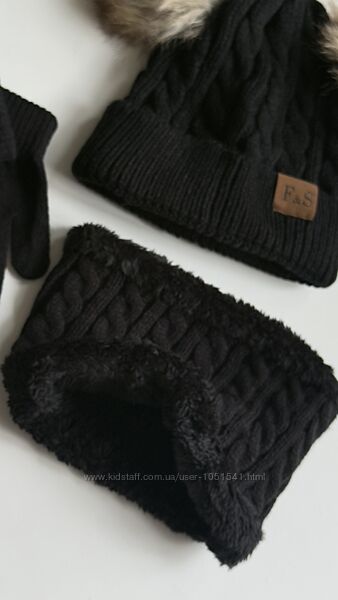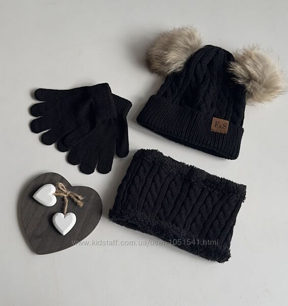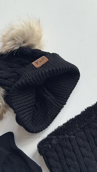 Теплий комплект ( евро зима )шапка- грубої в"язки без підкладки , снуд- подвійний з штучним хутрок і трикотажні рукавички колір - чорний , помпони-штучне хутроРІСТ 98-104 ( на 2-4 роки шапка висота-18 об,єм-20 см , снуд висота 15 ширина 22 рукавички -14 см)